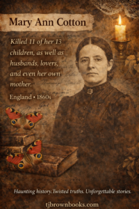 Mary Ann took on two lovers and one of them died after changing his will, leaving Mary Ann with everything. One of the Cotton boys was still with her and she tried to get a parish official to put him in a workhouse. He died five days after the attempt failed and the official went to the police to have them investigate. The local newspaper latched on to the story and soon discovered that Mary Ann had lost four husbands, 11 children, her mother and a lover. Mary Ann was soon arrested, but the trial was delayed because Mary Ann was pregnant. The lucky child was taken away soon after birth, Mary Ann was found guilty of one murder, though suspected of many more.